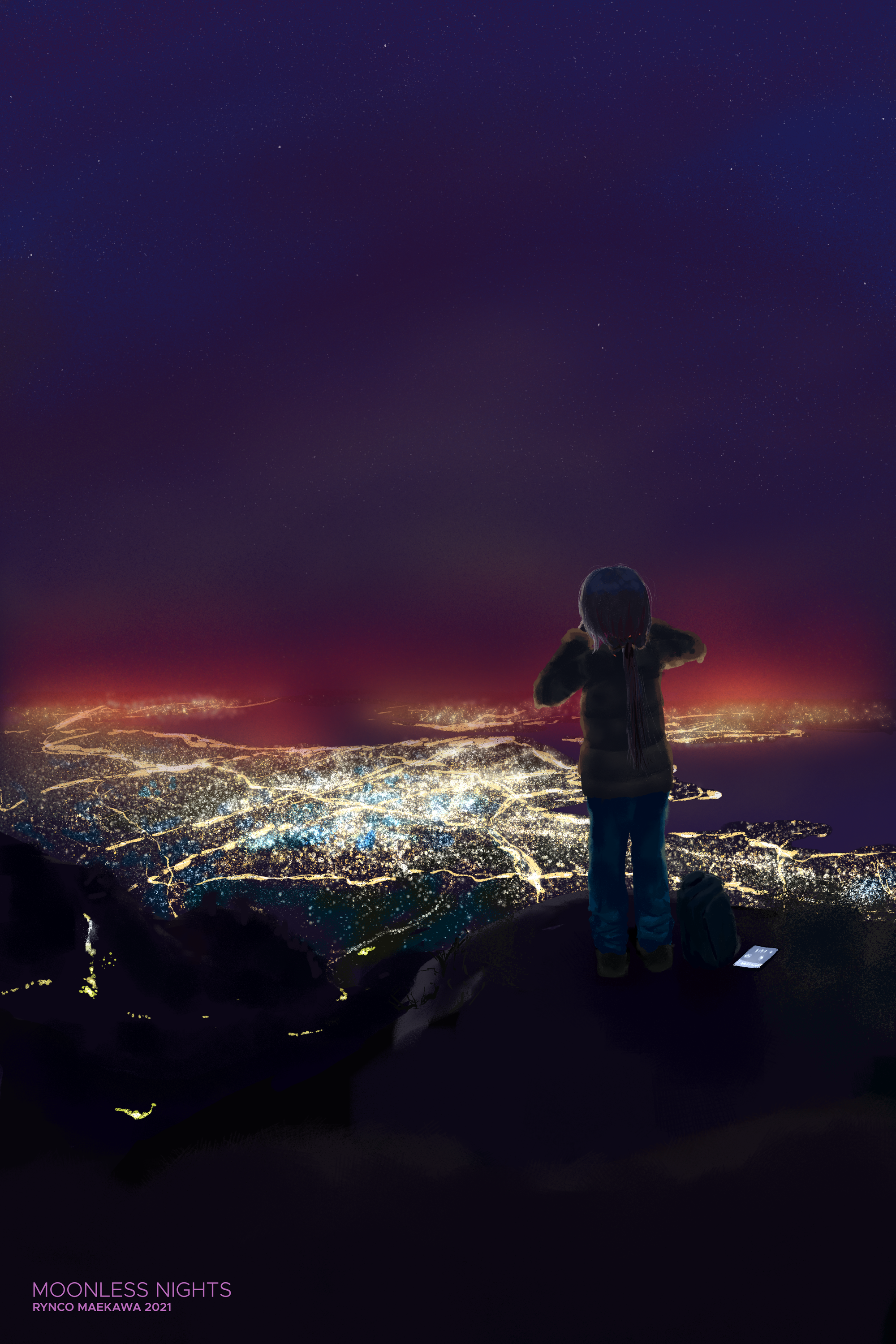 在没有月光的夜里,雾气将远方的灯火化作一片朦胧。